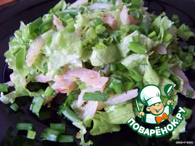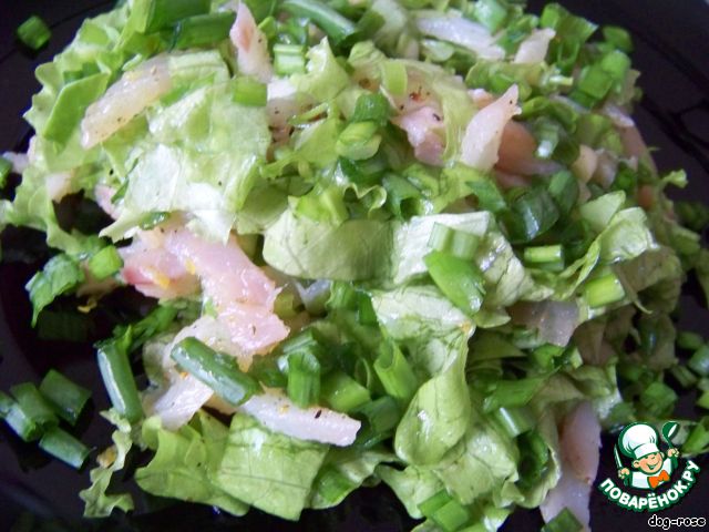 Салат легкий, готовится за считанные минуты, вкусный и полезный. Лимон и приправы дают легкую кислинку (она здесь очень кстати) и интересный аромат. Рецепт этого блюда был размещен на сайте в 2008 году пользователем Вика под названием "Салат с балыком" и иллюстрирован мной в рамках акции "Раскраски".