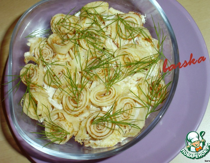 Добавить майонез с чесноком, перемешать, выложить в салатницу. украсить третьим блинчиком, нарезанным в виде спиралек. Дать немного настояться.