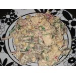 Интересный и сытный салат с лeгким чесночным привкусом из простых ингредиентов. Рецепт этого блюда был размещeн на сайте в 2007 году пользователем Юля под названием "Салат из блинов с курицей" и иллюстрирован мной в рамках акции "Раскраски".