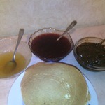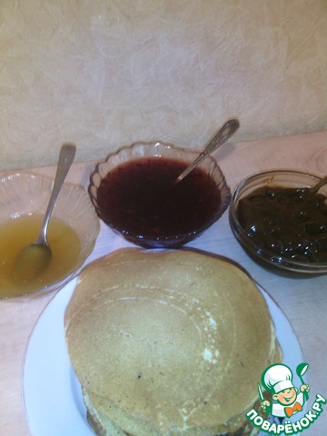 Отличные оладушки получились! :good: Жаль, клубники не нашлось - заменили малиновым джемом и мёдом.