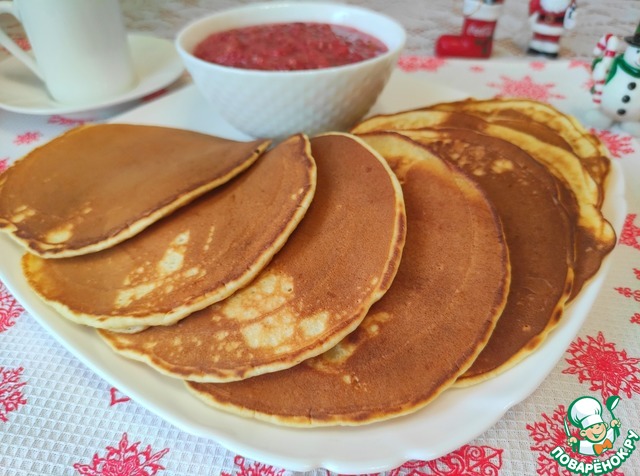 Еще в школе подруги подарили мне энциклопедию "Домашняя выпечка". Вот из нее этот рецепт. Полное название "Американские оладьи к русской масленице", но ведь до нее еще далеко, а побаловать себя вкусным завтраком можно и сейчас...