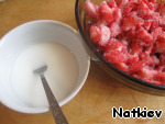 • Клубнику смешать с 1/4 стакана сахара, крахмал развести водой.