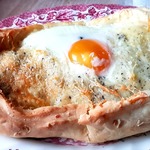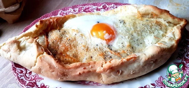 Из дрожжевого безопарного теста раскатать пласт толщиной 1-1,5 см и положить на смазанный маслом противень. Края пласта смазать яйцом и уложить бортик из теста диаметром 1 см, который также смазать яйцом. Сыр (сулгуни пополам с брынзой) растереть на крупной терке или мелко порубить, перемешать с тремя вареными рублеными яйцами. Эту смесь равномерно распределить по тесту и после расстойки (20-30 мин) выпекать изделие в течение 10-15 мин до полуготовности при температуре 200-220° С. Затем поверхность залить тремя сырыми яйцами и продолжать выпечку до свертывания яиц.