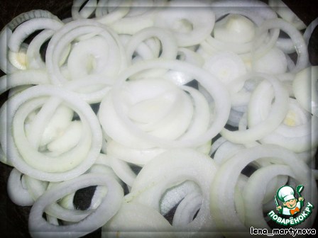 В широкую толстостенную посуду укладываем половину нарезанного кольцами репчатого лука. -