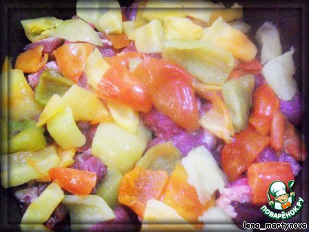 Болгарский перец чистим, режем крупно и укладываем на мясо.