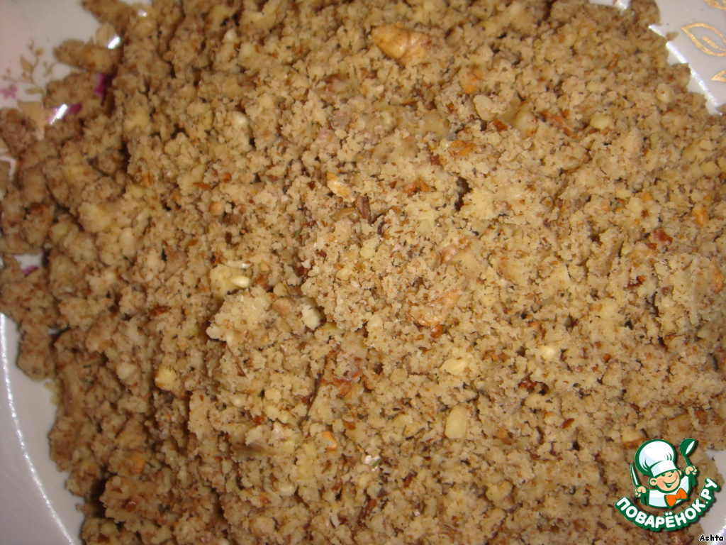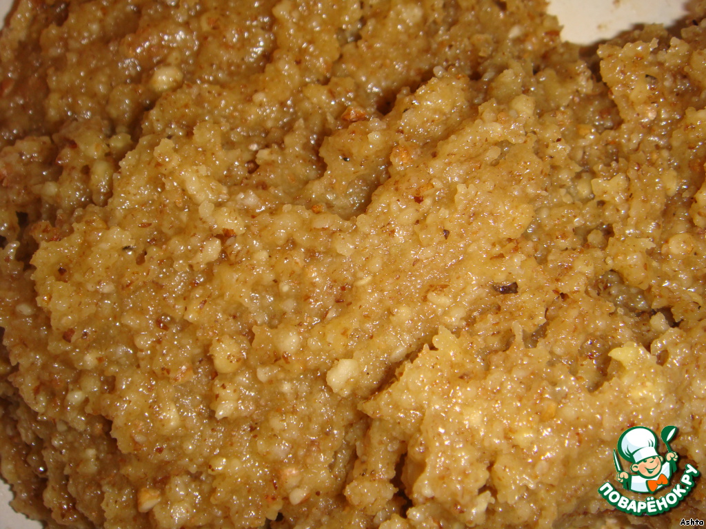Орехи перекрутить на мясорубке или перемолоть в комбайне.