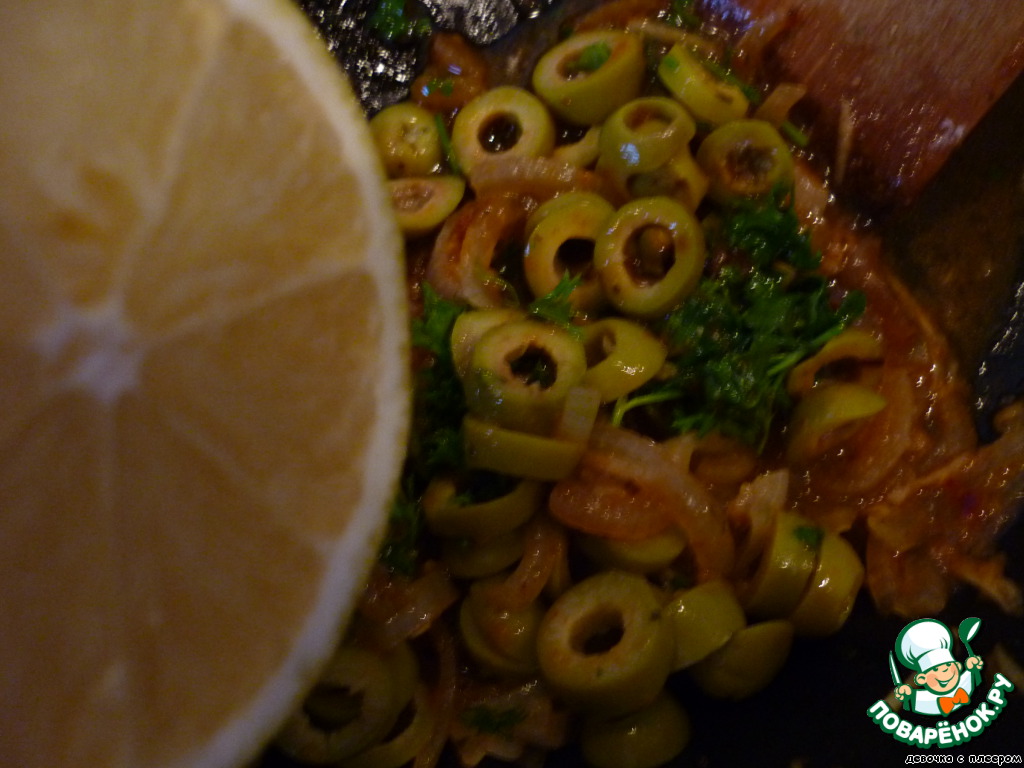 В соус, который остался на сковороде, добавить оливки, нарезанные кружочками, петрушку и лимонный сок. Хорошо перемешайте. -
