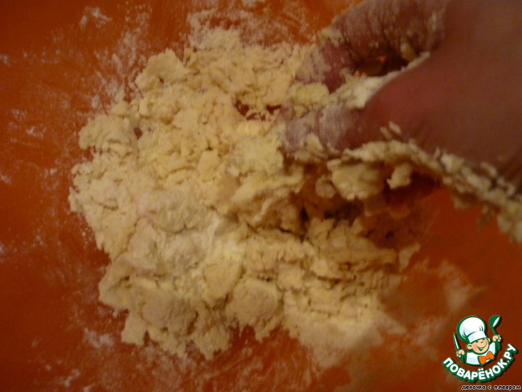 В большую миску просеять муку, добавить разрыхлитель, щепотку соли. Положить сливочное масло, нарезанное маленькими кусочками, сахарную пудру. Перемешать. |