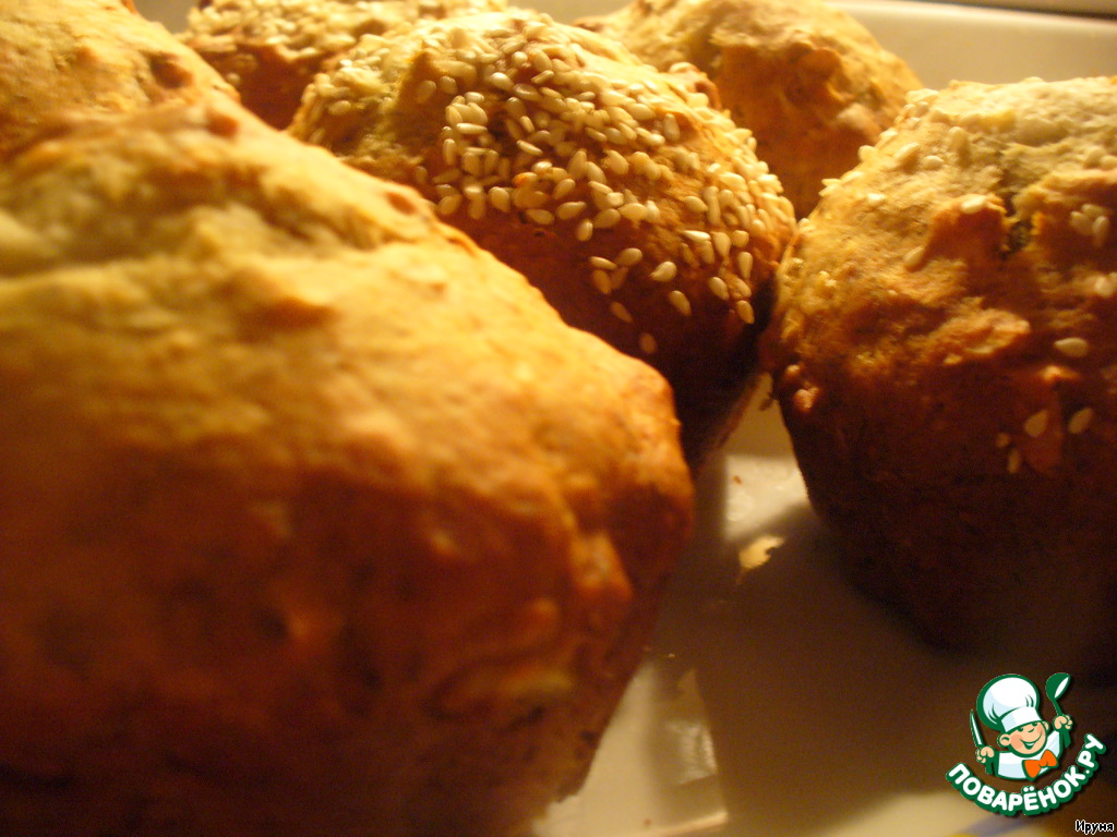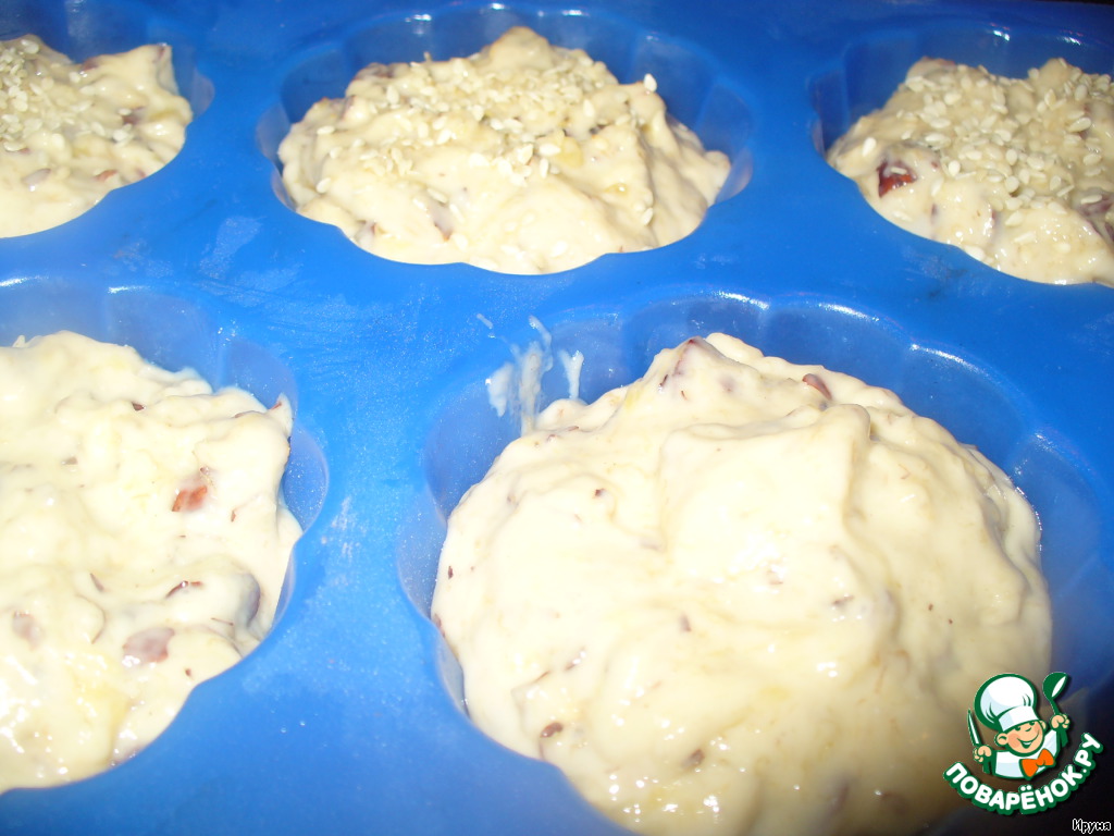 • Тесто разложить по формам для выпечки маффинов. Из данного количества теста у меня получилось 6 кексов. При желании, можно посыпать кексы перед выпечкой кунжутом. Я 3 шт. посыпала, 3 - нет. В данном случае, кунжут как-то не повлиял ни на что. И с ним было хорошо, и без него неплохо...