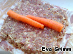 На подготовленную плетенку из бекона выкладываем фарш, в серединку кладем отваренные морковки (я немного не доварила специально, чтобы она "дошла", пропитавшись мясным соком, запекаясь в духовке).