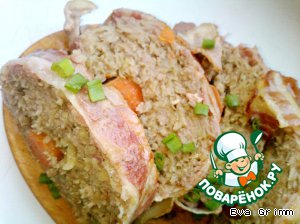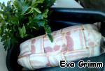 Когда я проходила в магазине мимо стеллажей с мясными продуктами, взгляд мой остановился на упаковке аппетитного бекона. Вспомнилась идея "шубки" из него, которую я давным-давно увидела на этом сайте, но так и не приготовила, и моя рука сама собой потянулась за упаковкой. В такой корочке рулет выходит очень сочным и вкусным как в горячем, так и в холодном виде; конечно, тут нет предела фантазии, а вот мой вариант начинки...