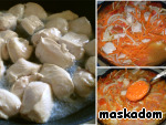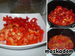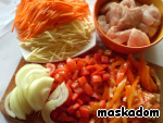 Филе режем на крупные куски. Морковь и корень пастернака нарезаем соломкой, помидоры - небольшими кубиками, сладкий перец - четвертинками колец, лук - полукольцами. -