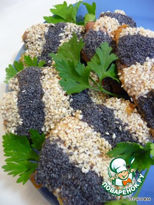 • Филе смазать взбитым яйцом и посыпать полосками (около 2 см) - кунжутом и маком.