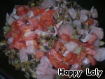 Помидор лучше сначала обдать кипятком, снять кожуру (дело в том, что она при жарке сворачивается и получается соломка, которая в желудке плохо переваривается, поэтому в некоторых блюдах ее лучше удалять) и режем кубиками.