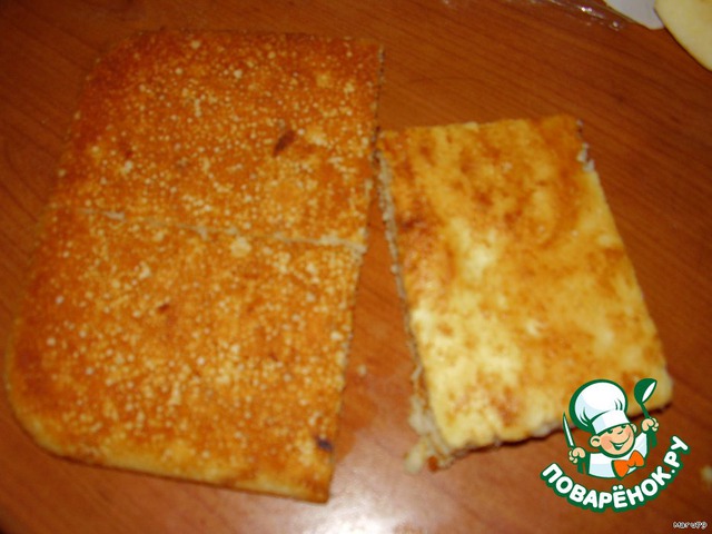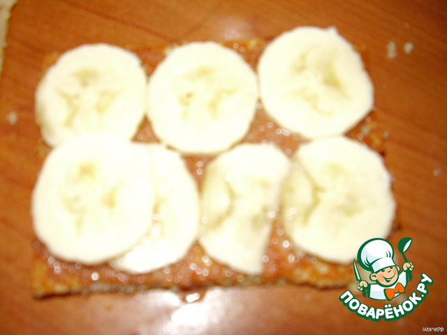Большой кекс смажьте кремом или сгущенкой, при желании выложите слой фруктов (у нас бананы) и положите еще один кекс.