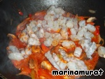Тушим все минут 5 под крышкой, потом добавляем креветки (мы разрезали каждую пополам, для сочности мяса) и тушим еще 5 минут.