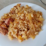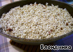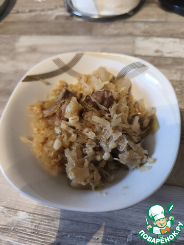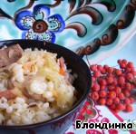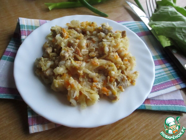 Поверх капусты выкладываем наш обжаренный бекон (честно говоря, это моя отсебятина, мне хотелось чтоб перловка чуточку пропиталась копчененьким, можно бекон оставить вместе с мясом), высыпаем перловку, предварительно тщательно промытую. Теперь заливаем будущий мульгикапсад водой так, чтоб вода покрыла капусту. Закрываем крышкой и можно отправлять в разогретую духовку примерно на 1 час 20 минут. В некоторых источниках советуют делать мульгикапсад на плите, но я решила, уж поскольку блюдо национальное, делать его в духовке (за неимением печи).
