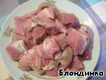 Для приготовления этого блюда нам понадобится совсем немного ингредиентов. Для начала нарезаем мясо небольшими кусочками, величиной с некрупный грецкий орех. Изначально автор рекомендовал брать шею, но я взяла заднюю ногу, то есть мясо более постное.