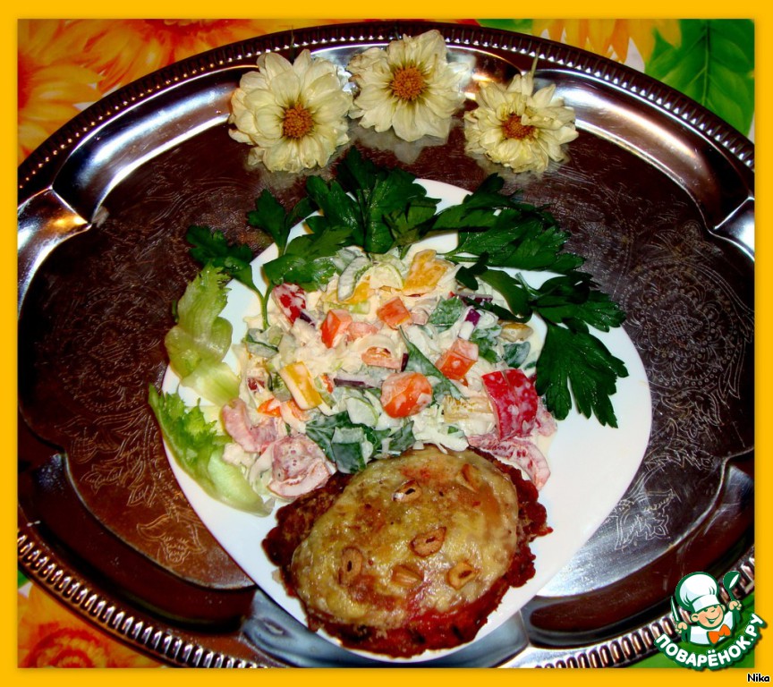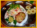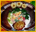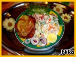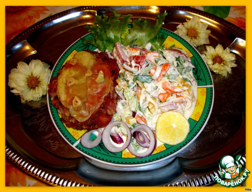 Салатик я подавала с вчерашними шницелями из курятины со свеклой.(У шницелей конечно немного изменился внешний вид, т.к их перед подачей на стол пришлось разогревать в микроволновке, сыр подтаял и стал прозрачным). Обычно я готовлю на один раз. Не люблю на следующий день есть то же самое. Но, как видели, шницелей было приготовлено целый противень и поэтому пришлось их оставить на сегодняшний ужин...https://www.povarenok.ru/recipes/show/51323/