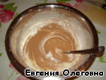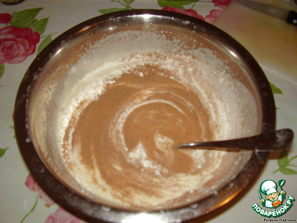 Постепенно вводить муку, предварительно смешанную с разрыхлителем и какао, замешивать тесто ложкой, хорошенько для получения однородной массы.