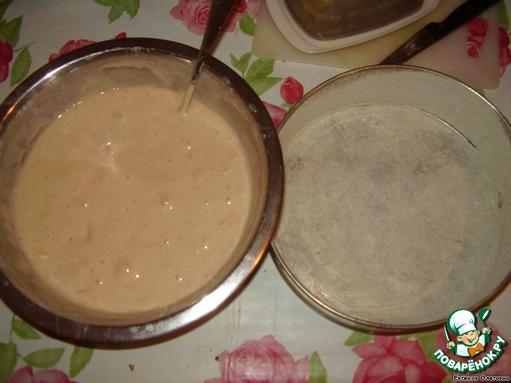 Яблоки смешать с тестом, форму для выпечки смазать сливочным маслом и обсыпать мукой (или манкой).