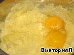 Картофель сварить до готовности, слить воду. Добавить сливочное масло, соль и растолочь в пюре. Когда остынет добавить яйца и манку и хорошо перемешать.
