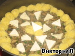 Выложить на пюре грибы, украсить верх пирога оставшимся пюре при помощи кондитерского шприца. Сверху разложить порезанную брынзу.