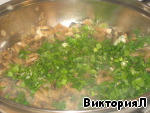 Добавить к луку порезанные грибы, соль, перец и обжарить до готовности, в конце добавить порезанную петрушку.