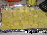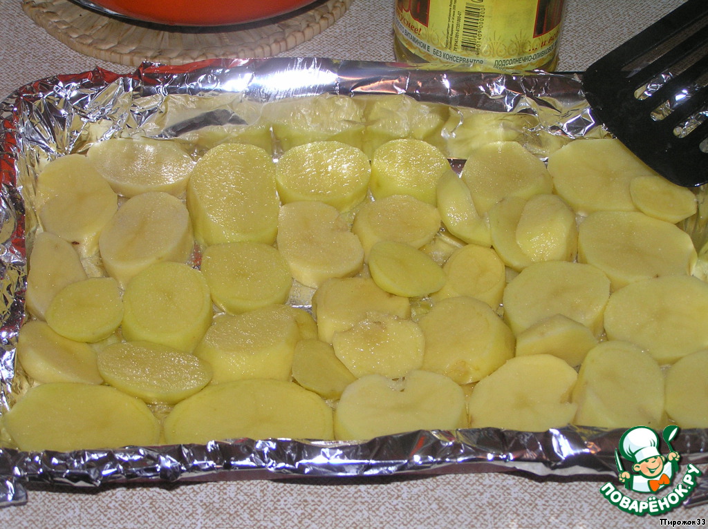 • В форму для запекания выложить картошку, порезанную кружочками. Посолить, можно посыпать паприкой.
