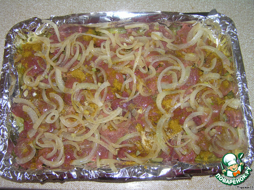 • На перец с картошкой выложить промытую и порезанную кусочками печенку, посолить, посыпать приправой. Мне очень нравится приправа "Хаваедж" https://www.povareno k.ru/recipes/show/41 297/. Выкладываем сверху обжаренный лук и натертое яблоко.