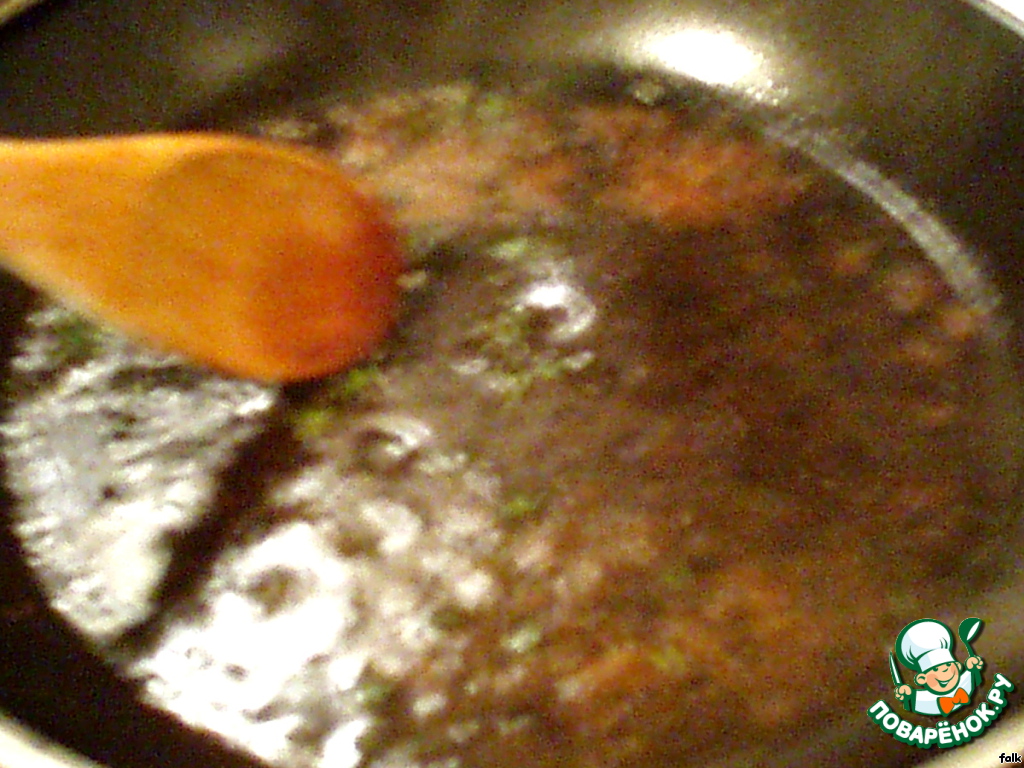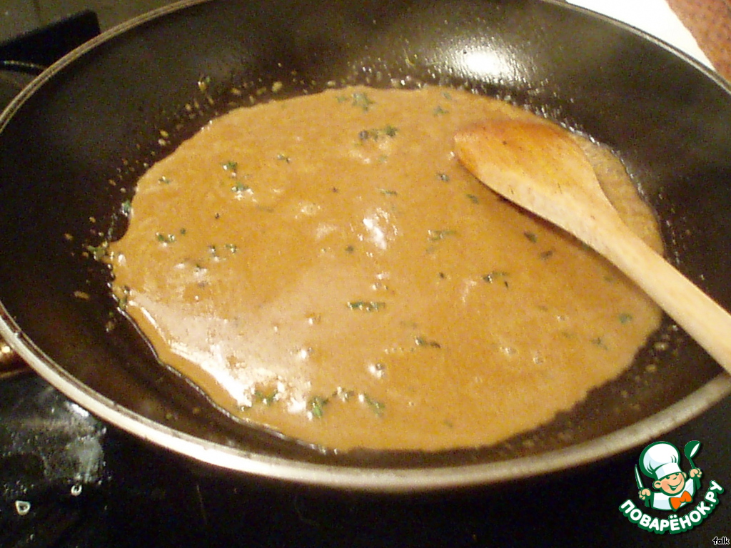 а мы займемся соусом: на сковороду, где жарилось мясо, выльем коньяк и мёд и закарамелизируем, мешая