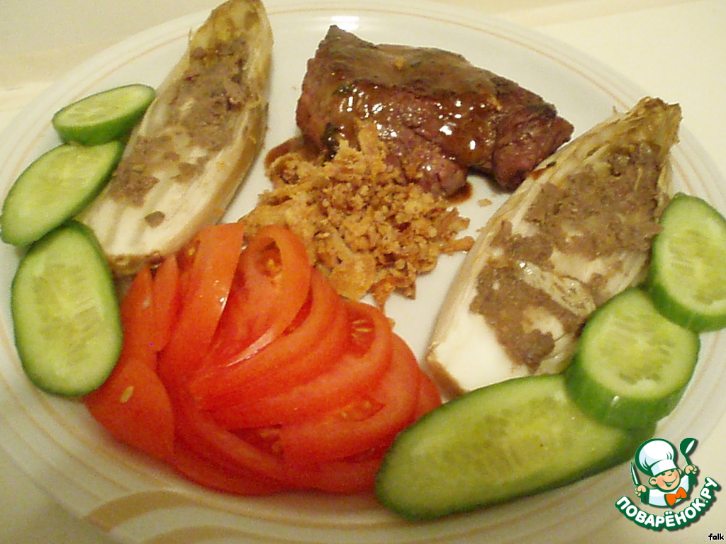 я подавала с салатным цикорием, овощами и сушеным жареным луком.