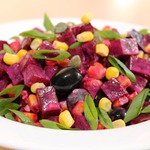 Описание: Вкусный питательный салат из нарезанной соломкой свеклы, половинок черных маслин, кукурузных зерен и каперсов, чуть сдобренных майонезом и оливковым маслом по вкусу. Пришло на ум сегодня утром, когда разбирала консервные баночки в кухонном шкафу. Получилось очень вкусно! И полезно :)