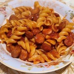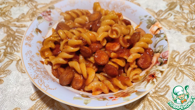 Выложить макароны на тарелку, а в центр макарон положить наши сосиски с соусом. Приятного аппетита!!!