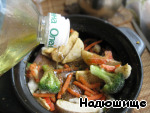 И покрываем соусом содержимое горшочка. При запекании соус сам найдет лазейки к овощам и мясу.