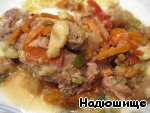 И начинаем выкладывать овощи и мясо слоями. Сначала овощи,