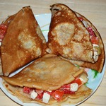 Кунжутные блинчики с сырыми овощами и острым творожно-огуречным кремом - необычные блинчики с кунжутом, помидорами, фетой и творожно-огуречным кремом. Рецепт этого блюда был размещeн на сайте в 2008 году пользователем Мышка-Катюша под названием "Тонкие блинчики с кунжутом и острым творожным кремом", и иллюстрирован мной в рамках акции "Раскраски".
