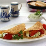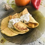 Испечь на оставшемся растительном масле 8 блинчиков. Наполнить их помидорным салатом и посыпать оставшимся кунжутом. Подавать с творожным кремом.