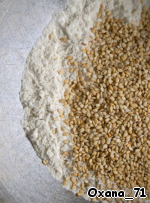 Поджарить кунжут на сухой сковороде. В миску просеять муку, добавить щепотку соли и 1/2 часть кунжутa.