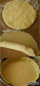 Полчаса прошло, достаем тесто. После «отдыха» оно становится очень пластичным и податливым, можно даже разминать его пальцами (специально сделала фото), но скалкой все-таки быстрее. Раскатываем тесто в пласт толщиной в 3-5 мм. Можно раскатывать на пленке, я по старинке подпылила стол мукой. Форму для пирога выстелила бумагой для выпечки, с ней потом удобнее пирог вынимать, а если предполагается резать пирог прямо в форме, то бумага и не нужна (в принципе, тесто к форме не прилипает, но если сомневаетесь, форму можно смазать слегка маслом). Переносим тесто в форму: поскольку тесто очень пластичное (порваться – не порвется, но деформироваться может сильно), это удобнее сделать с помощью скалки. Обрезаем лишнее, оставляя бортики 3-4 см, накалываем тесто вилкой и отправляем в разогретую на среднем огне духовку минут на 10-15.