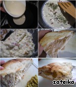 Выливаем оставшуюся заливку на разогретую сковороду (можно даже без масла), щедрой рукой подсыпаем в нее любимые приправы (я добавила сушеные петрушку и паприку, хотя конечно, лучше свежую) и, перемешивая, доводим до загустения. В принципе, это блюдо универсальное: его можно кушать просто так, очень вкусно использовать как соус, можно намазать на ржаной хлеб, я люблю разрезать кусок грузинского (толстого) лаваша (в морозилке всегда лежит несколько), добавить в начинку оливки (они ведь тоже остались) или даже соленый огурчик – и во внутрь, а можно сделать рулет из лаваша армянского, или просто завернуть в лист салата. Основа невероятно вкусная, а фантазии есть, где разгуляться.