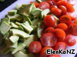 Авокадо разрезаем пополам, вынимаем косточку, чистим и режем четвертинками. Помидоры черри - пополам.