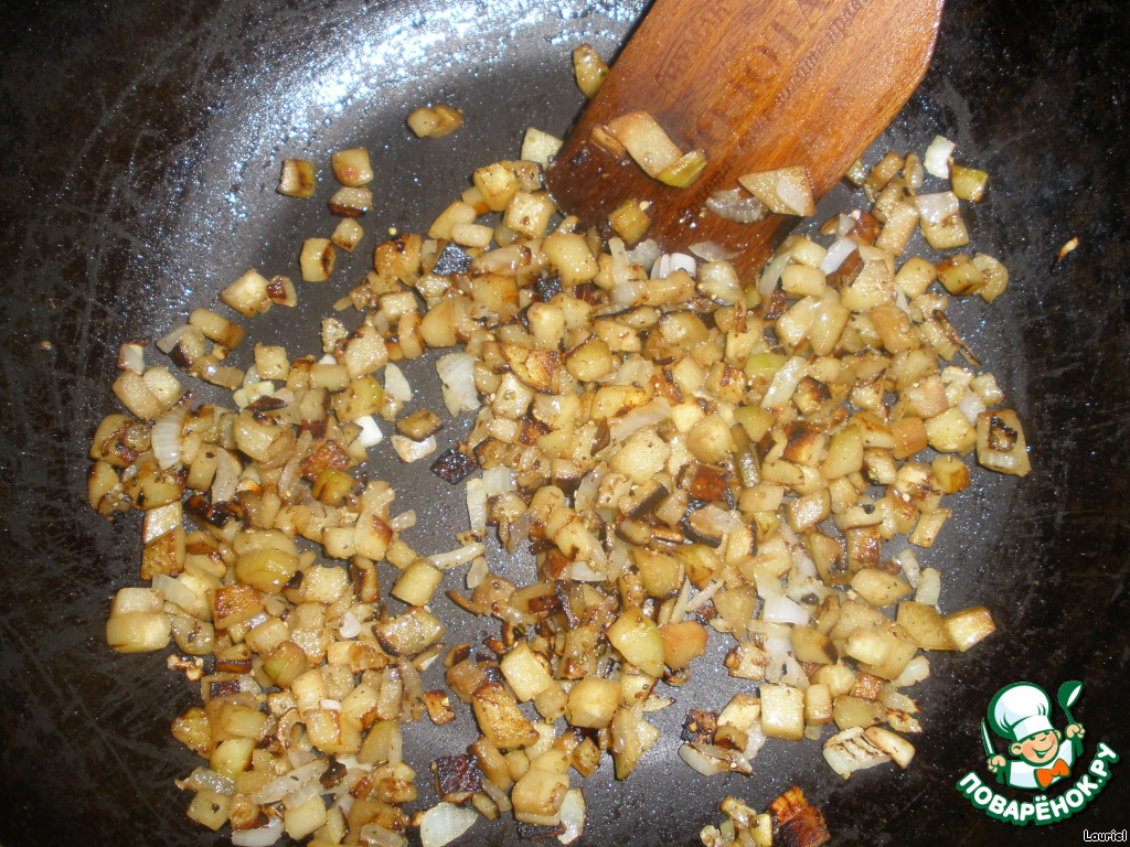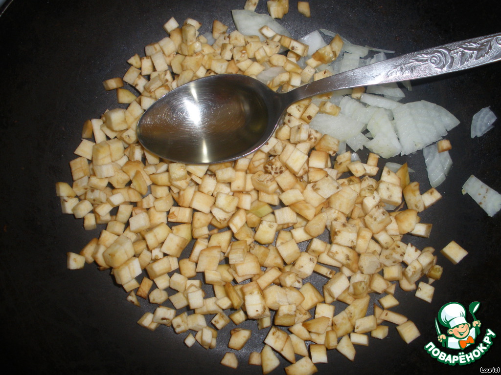 • Лук и баклажан мелко нарезать, положить в сковороду, добавить масло, поставить на средний огонь.