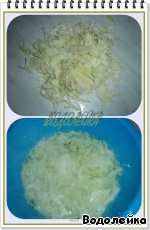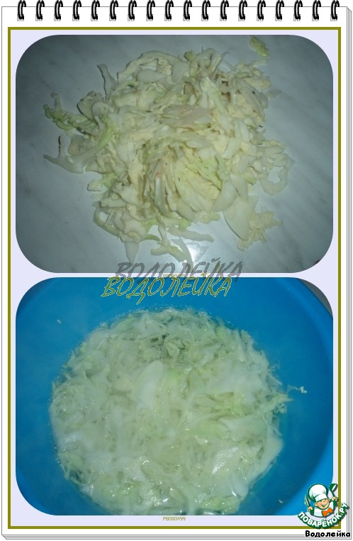 Белокочанную капусту нашинковать и залить кипятком на пару минут (вес в ингредиентах дан уже нашинкованной капусты).