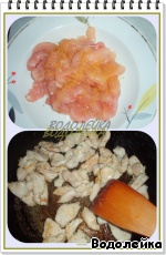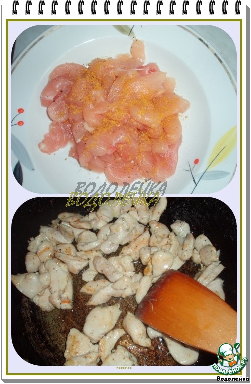 Куриную грудку (количество грудок зависит от их величины, если грудки крупные-, взять 2 шт., если не очень - тогда 3) разрезать на небольшие кусочки, посолить, поперчить и посыпать карри. Дать немного постоять.