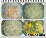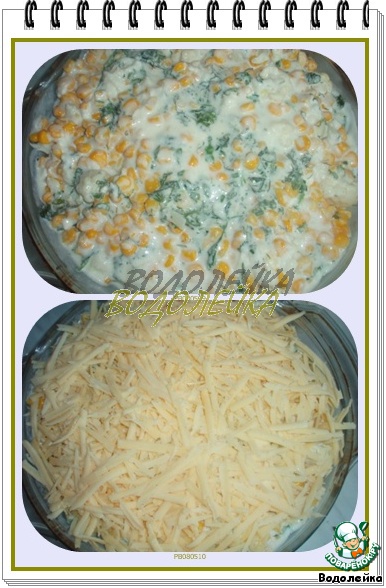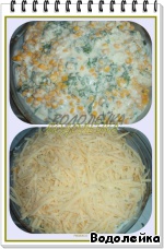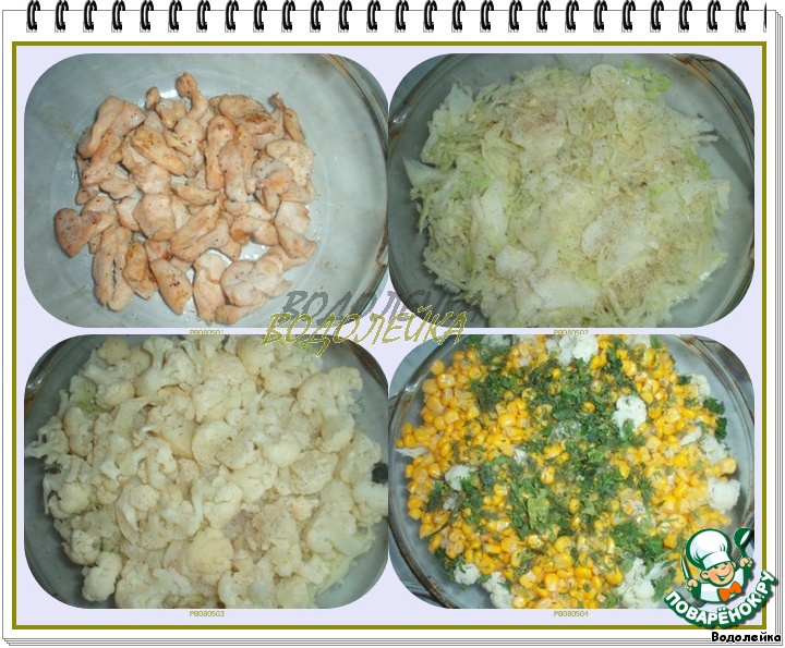 Теперь берем огнеупорную форму и укладываем слоями: курица, капуста белокочанная (немного посолить ее), капуста цветная(немного посолить ее), кукуруза и горошек (у меня горошка не оказалось, поэтому я взяла двойную порцию кукурузы),