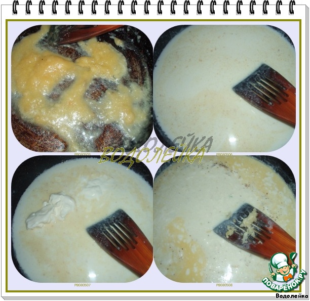 в сковороде растопить сливочное масло + мука, немного обжарить. После влить молоко и добавить майонез и сметану. Все хорошо перемешать, чтобы не было комков.