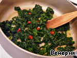 Разогреть в сковороде сливочное масло и 1 ст. ложку оливкового, добавить шпинат и нарезанный чили, прогревать все пару минут на небольшом огне.