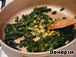 Как только шпинат начнет «вянуть», снять его с огня, добавить 1 ч. ложку лимонного сока и тертую цедру, все хорошенько перемешать.