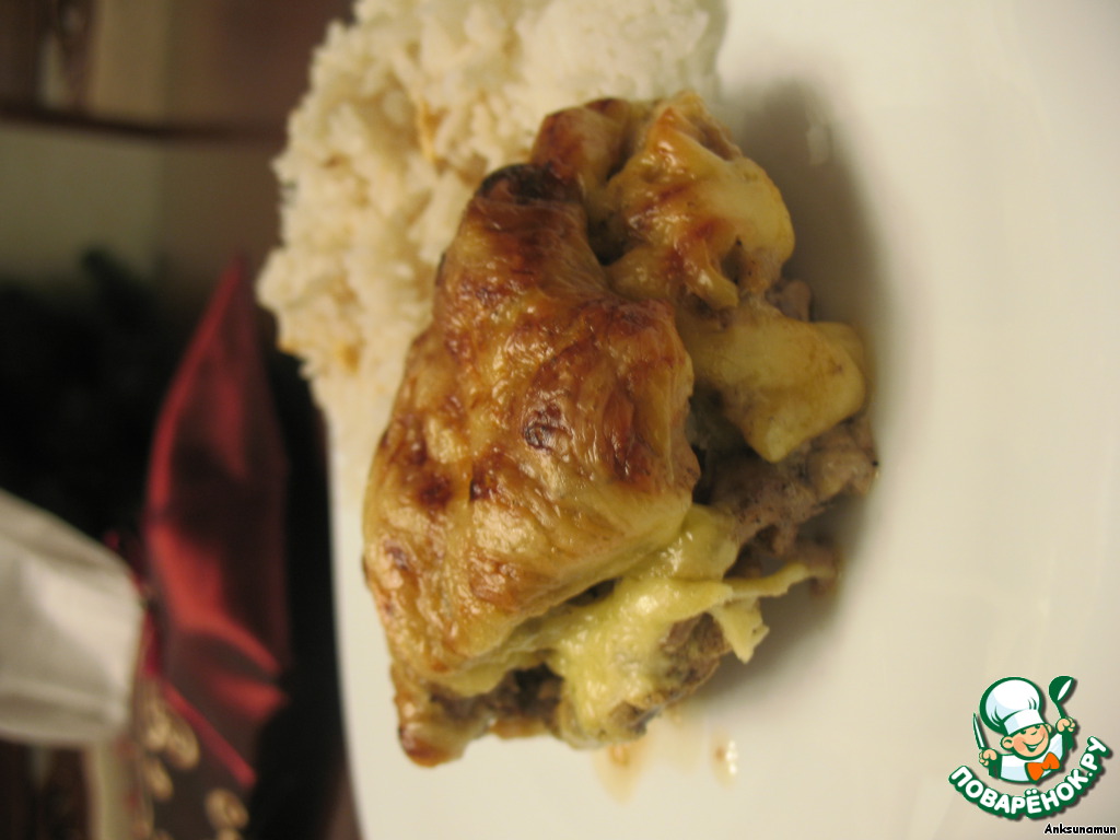 Посыпаем мясо сыром и оставляем ещё на 20-25 минут для запекания до румяной корочки.